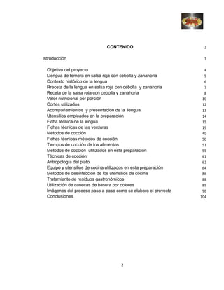 Este documento presenta la receta de lengua de ternera en salsa roja con cebolla y zanahoria. Incluye información sobre el contexto histórico de la lengua y la ternera, los ingredientes y pasos para preparar la lengua y la salsa, el valor nutricional, los cortes utilizados y detalles sobre la presentación del plato. El objetivo es aprender sobre la preparación tradicional de este plato y promover el consumo de alimentos frescos y nutritivos.