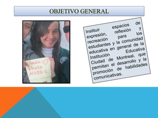El documento presenta el proyecto comunicativo "Hablemos Claro" de la Institución Educativa Distrital Ciudad de Montreal. El proyecto busca crear espacios de comunicación que permitan la expresión, el intercambio de ideas y el fomento del respeto por la diversidad entre la comunidad educativa. Algunas de las actividades que incluye son la publicación de periódicos murales y digitales, el uso de la emisora y el blog escolar, y la creación de videos e información a través de las TIC.