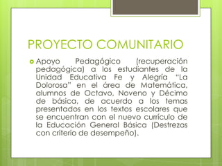 La estudiante Nelly Flores realizó un proyecto comunitario en la Unidad Educativa Fe y Alegría "La Dolorosa" brindando apoyo pedagógico en matemáticas a estudiantes de octavo, noveno y décimo grado. El proyecto consistió en clases de recuperación en temas como congruencia de triángulos, inecuaciones y áreas y volúmenes. Tanto los estudiantes como la autora concluyeron que este tipo de apoyo mejora la comprensión de los temas y la seguridad de los