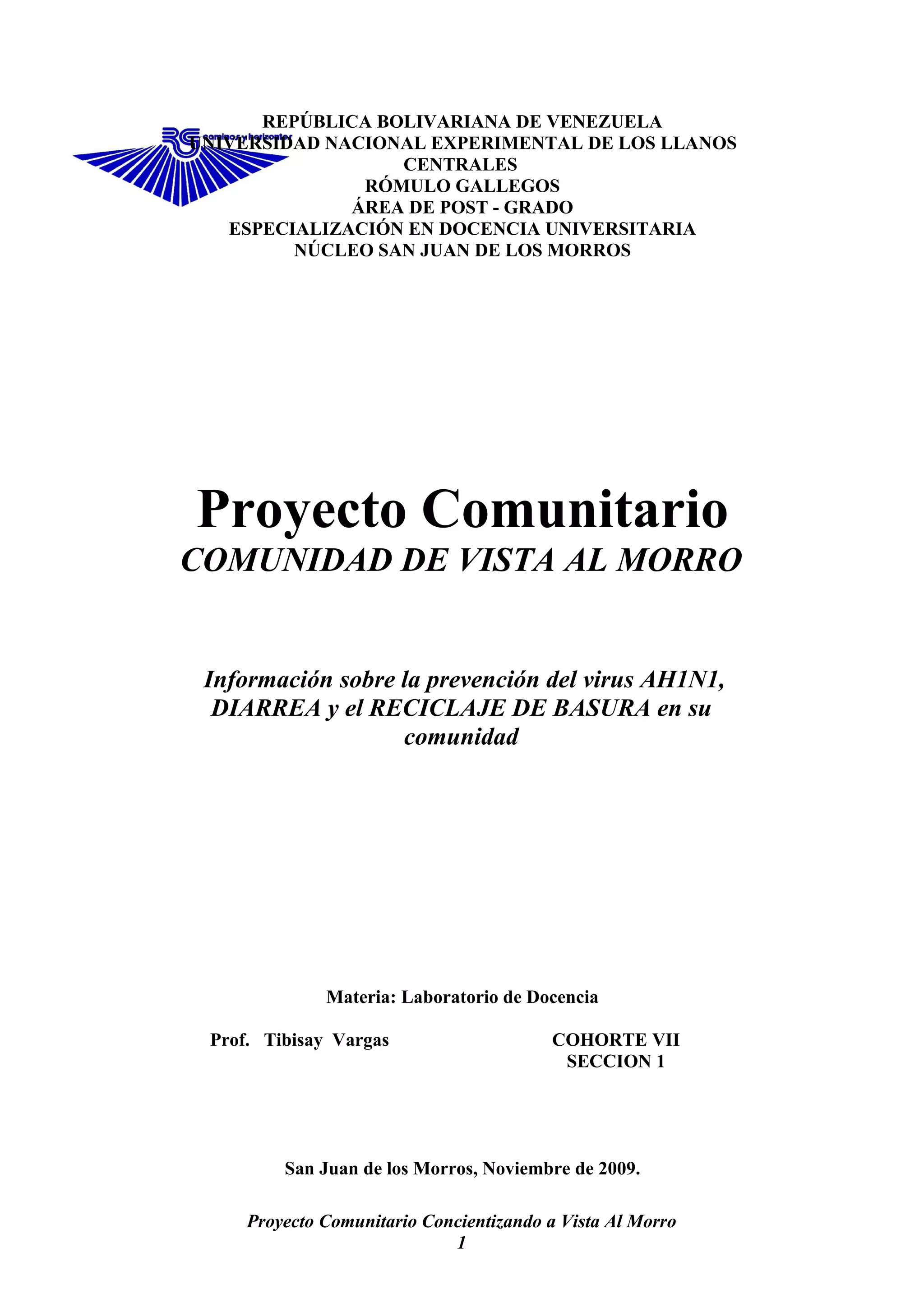 Este proyecto comunitario tuvo como objetivo educar e informar a la población de Vista Al Morro sobre la prevención de la influenza AH1N1, el uso adecuado de la basura y la prevención de la diarrea. Se realizó un diagnóstico de la comunidad para identificar sus necesidades en materia de salud. Luego, se llevó a cabo un taller informativo donde se educó a los habitantes sobre estas temáticas a través de charlas y actividades participativas. El proyecto buscó promover comportamientos saludables