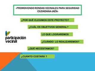 Este proyecto busca promover la organización de rondas vecinales para mejorar la seguridad ciudadana en Jaén, Perú. Se llevará a cabo entre agosto y diciembre de 2013 con la participación de la Municipalidad de Jaén y la UGEL. El objetivo principal es reducir la delincuencia a través de la prevención, reinsertar a los jóvenes en la sociedad y sensibilizar sobre las consecuencias de los delitos. Se necesitarán recursos humanos, materiales y unos 2,500 soles para difundir el proyecto,