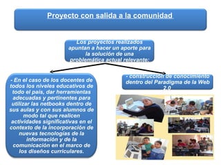 El proyecto busca capacitar a docentes de todos los niveles educativos en el uso de netbooks para realizar actividades significativas que integren nuevas tecnologías en el aula. Se enfoca en construir conocimientos usando los recursos académicos propuestos por el ministerio de educación, así como fomentar la innovación y el liderazgo en los alumnos para resolver problemáticas sociales reales. Además, se aspira a que los estudiantes generen productos de alta calidad que respondan a desafíos sociales significativos.