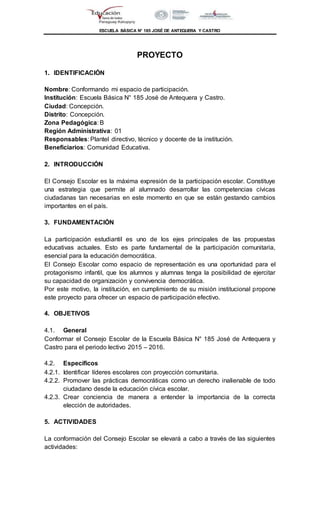 Este documento presenta el proyecto de la Escuela Básica N° 185 José de Antequera y Castro para conformar su Consejo Escolar para el período lectivo 2015-2016 a través de un proceso electoral. El proyecto detalla los objetivos, actividades y recursos requeridos para llevar a cabo el proceso de elección, que incluye la conformación de un Tribunal Electoral, la elaboración de un calendario electoral y la realización de las elecciones.