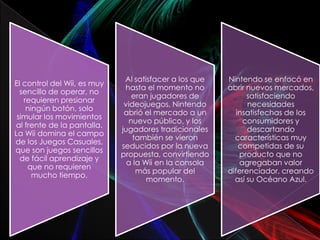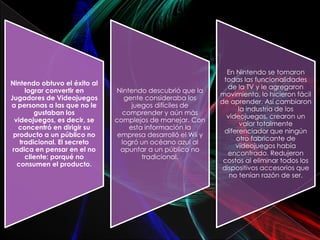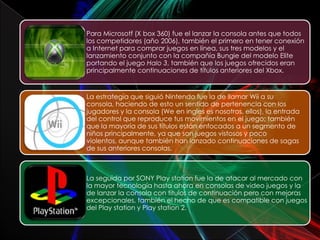 El documento presenta un proyecto sobre consolas de videojuegos que analizará las ventajas competitivas de empresas como Nintendo, Xbox y PlayStation. El proyecto busca responder preguntas sobre estrategias como océano azul, innovación y posicionamiento global. Se revisarán factores como historia, competidores, sustitutos, ventajas/desventajas, innovaciones estrategias de mercado.