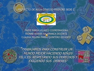 Este documento presenta un proyecto de aula cuya meta principal es desarrollar la jornada académica completa una vez por semana implementando actividades curriculares en la sala de informática del colegio Maiporé. El proyecto busca involucrar el uso de las TIC en el desarrollo diario de clases y motivar a los docentes y estudiantes. Incluye preguntas problematizadoras, programación de áreas como comunicativa, cognitiva y socio-política, y planes de acción, recursos, responsables y resultados.