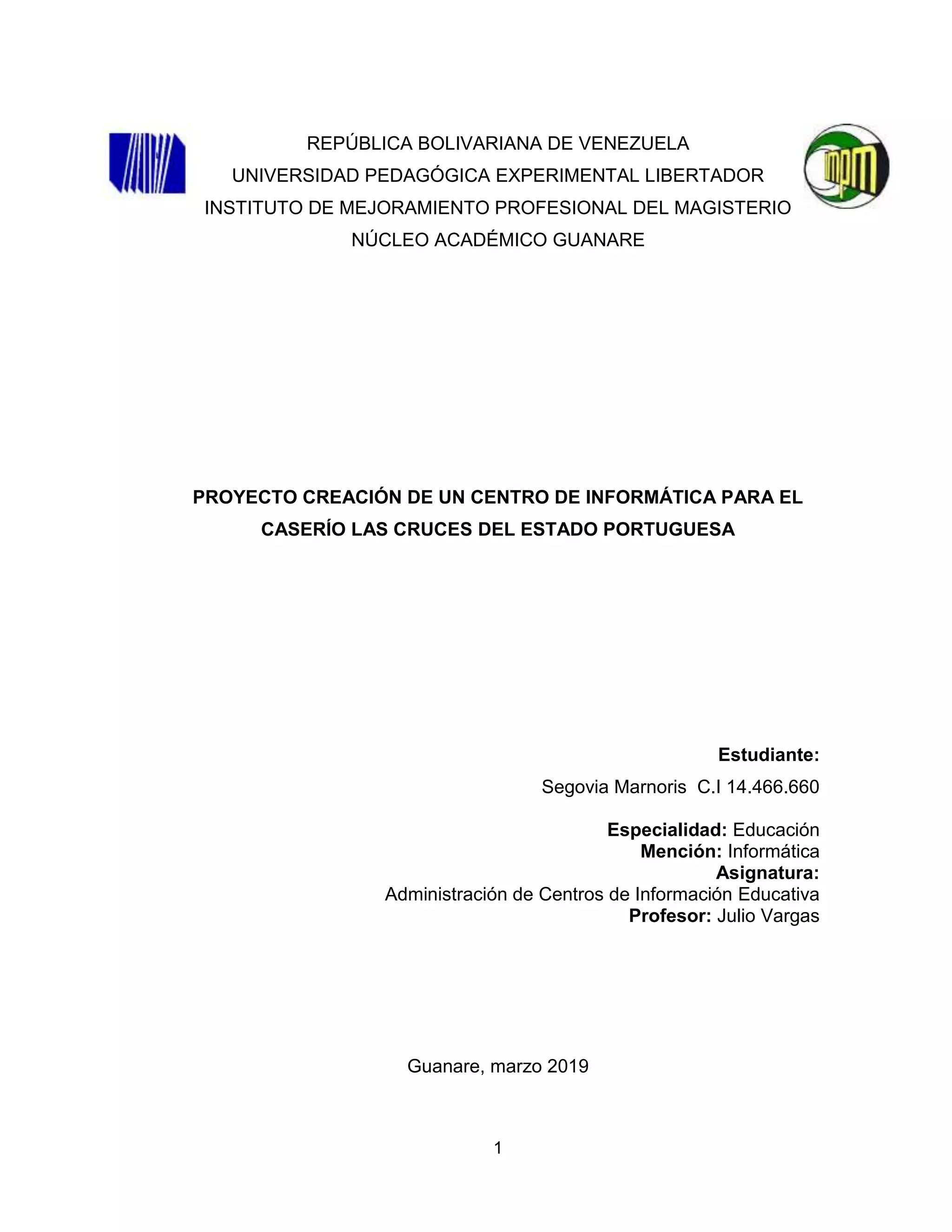 El documento presenta un proyecto para la creación de un centro de informática en el caserío Las Cruces, Estado Portuguesa, con el objetivo de mejorar el acceso a tecnologías de información entre los estudiantes y la comunidad. Se abordan las fases del planteamiento del problema, diagnóstico, planificación e intervención, así como los objetivos de investigación necesarios para implementar este proyecto. La relevancia de este centro radica en el escaso acceso a internet y tecnología en la comunidad, lo cual afecta el desarrollo académico y social de sus habitantes.