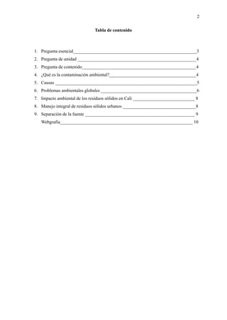 La contaminación ambiental causada por el mal manejo de residuos sólidos en Santiago de Cali genera problemas como la contaminación de suelos, aguas y aire, así como focos de infección y plagas. Es importante crear conciencia pública y aplicar un manejo integral de los residuos que incluya su separación en la fuente en grupos como aprovechables, no aprovechables y orgánicos.