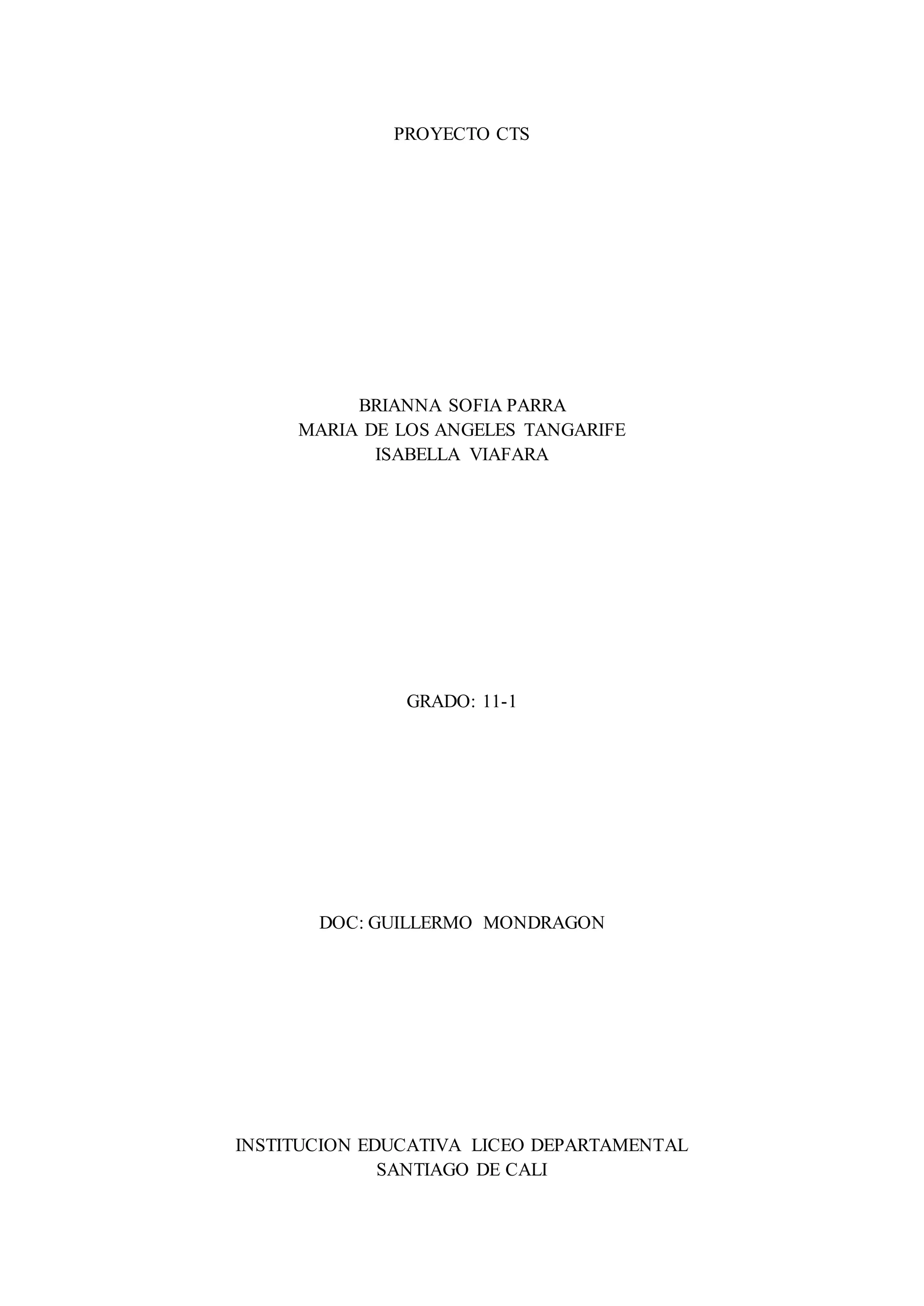 Este documento presenta un proyecto realizado por tres estudiantes de grado 11 llamadas Brianna Sofia Parra, Maria de los Angeles Tangarife e Isabella Viafara de la Institución Educativa Liceo Departamental de Santiago de Cali bajo la supervisión del profesor Guillermo Mondragón.