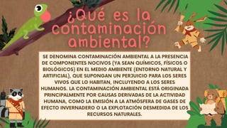 Este documento describe los problemas relacionados con la contaminación ambiental causada por el mal manejo de basuras y residuos sólidos en la ciudad de Cali, Colombia. La acumulación de desechos en hogares, espacios públicos y cauces de agua ha generado malos olores, enfermedades y afectaciones a la salud de las comunidades. Se han realizado operativos para mejorar la recolección y disposición de residuos, así como campañas de educación ambiental en escuelas para crear conciencia sobre la importancia de cuidar los recursos natural