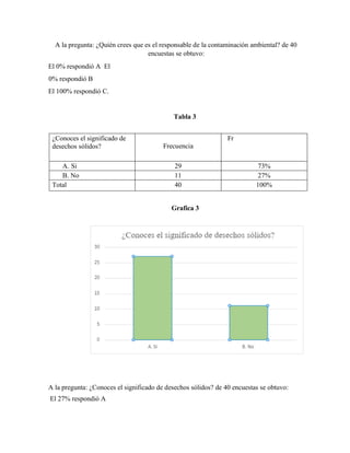 El documento presenta los resultados de una encuesta realizada a 40 personas sobre contaminación ambiental. Los resultados mostraron que el 100% de los encuestados cree que la gente es la responsable de la contaminación, el 73% conoce el significado de desechos sólidos, y el 81% cree que la contaminación afecta el día a día de los residentes de Cali y es nociva para la salud.