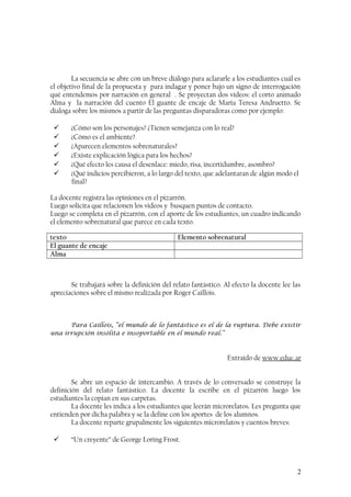 La secuencia didáctica propone trabajar con relatos fantásticos y de terror a través de la lectura y análisis de textos de diversos autores. Las actividades buscan que los estudiantes desarrollen la capacidad de lectura crítica, reconozcan las características de los diferentes géneros y vinculen la literatura con otras expresiones artísticas. Se presentan cuentos y audiotextos para su análisis, identificando elementos como el uso de lo sobrenatural, las emociones que provocan y las posibles explicaciones de los