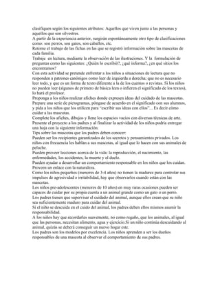 Este documento proporciona instrucciones para un proyecto escolar sobre el cuidado de las mascotas. Los estudiantes crearán carteles con una poesía sobre diferentes animales domésticos y sus sonidos. Aprenderán sobre la clasificación de animales domésticos y silvestres a través de actividades prácticas. También completarán fichas sobre las mascotas de sus familias y aprenderán sobre la responsabilidad de cuidarlas.