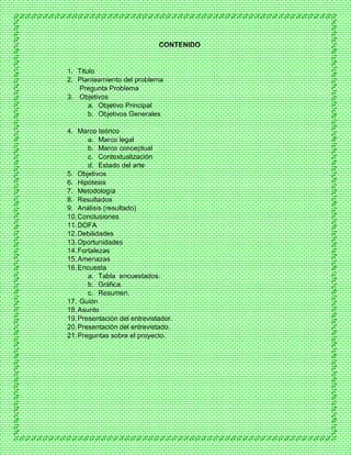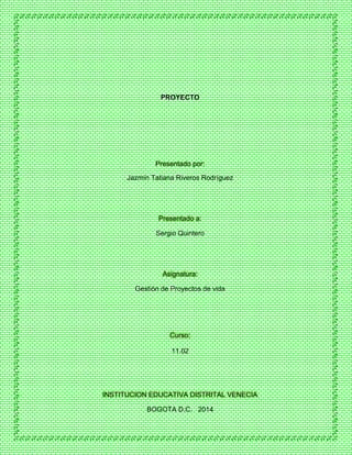 Este documento presenta un proyecto sobre la creación de jardines en la Institución Educativa Distrital Venecia en Bogotá. El proyecto analiza el problema de la falta de atención a las zonas verdes de la escuela y propone objetivos para mejorar los espacios verdes e inculcar conciencia ambiental en la comunidad estudiantil. Incluye marco legal sobre medio ambiente y funciones de entidades como el Ministerio de Medio Ambiente y las Corporaciones Autónomas Regionales.