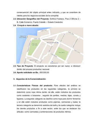 El documento proporciona información sobre una solicitud de financiamiento para la empresa Curiel & Asociados, F.P. La empresa se dedica a la confección y comercialización de ropa íntima, prendas de vestir, calzado y cosméticos. Se incluye información sobre la identificación de la empresa, el proyecto propuesto, aspectos de comercialización, ingeniería del proyecto y capacidad de producción estimada.
