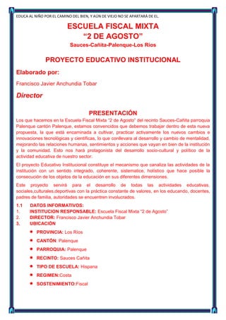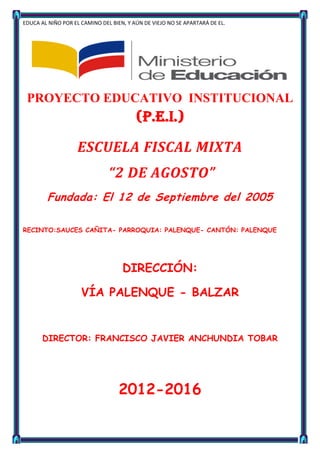 Este documento presenta el Proyecto Educativo Institucional (PEI) de la Escuela Fiscal Mixta "2 de Agosto" para el período 2012-2016. El PEI describe la misión, visión y objetivos de la escuela, así como el perfil del estudiante y del docente. Además, incluye un análisis FODA para identificar fortalezas, oportunidades, debilidades y amenazas de la institución.