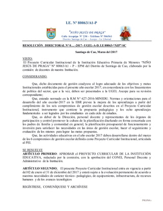 El proyecto curricular institucional de la IE Niño Jesús de Praga busca mejorar los aprendizajes a través de seis compromisos de gestión escolar, en alineación con las políticas educativas para el año 2017. Fomenta la participación de la comunidad educativa y establece objetivos claros centrados en el desarrollo integral de los estudiantes, valorando las prácticas pedagógicas y la utilización de tecnologías. El documento también identifica problemáticas pedagógicas y propone estrategias para abordar el desinterés estudiantil y promover una educación inclusiva y de calidad.