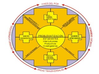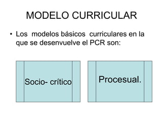 El documento presenta información sobre diferentes modelos curriculares, incluyendo el modelo socio-crítico y el modelo procesual. El modelo socio-crítico se enfoca en la educación como una herramienta de emancipación y cambio social, mientras que el modelo procesual enfatiza el desarrollo profesional continuo de los maestros a través de la investigación y el análisis de sus propias prácticas. También se discute el concepto de problematización y su importancia para el desarrollo del pensamiento crítico. Finalmente,
