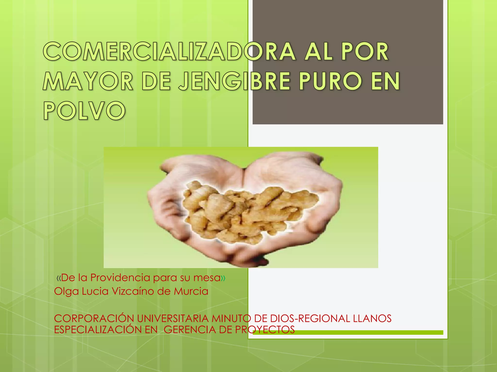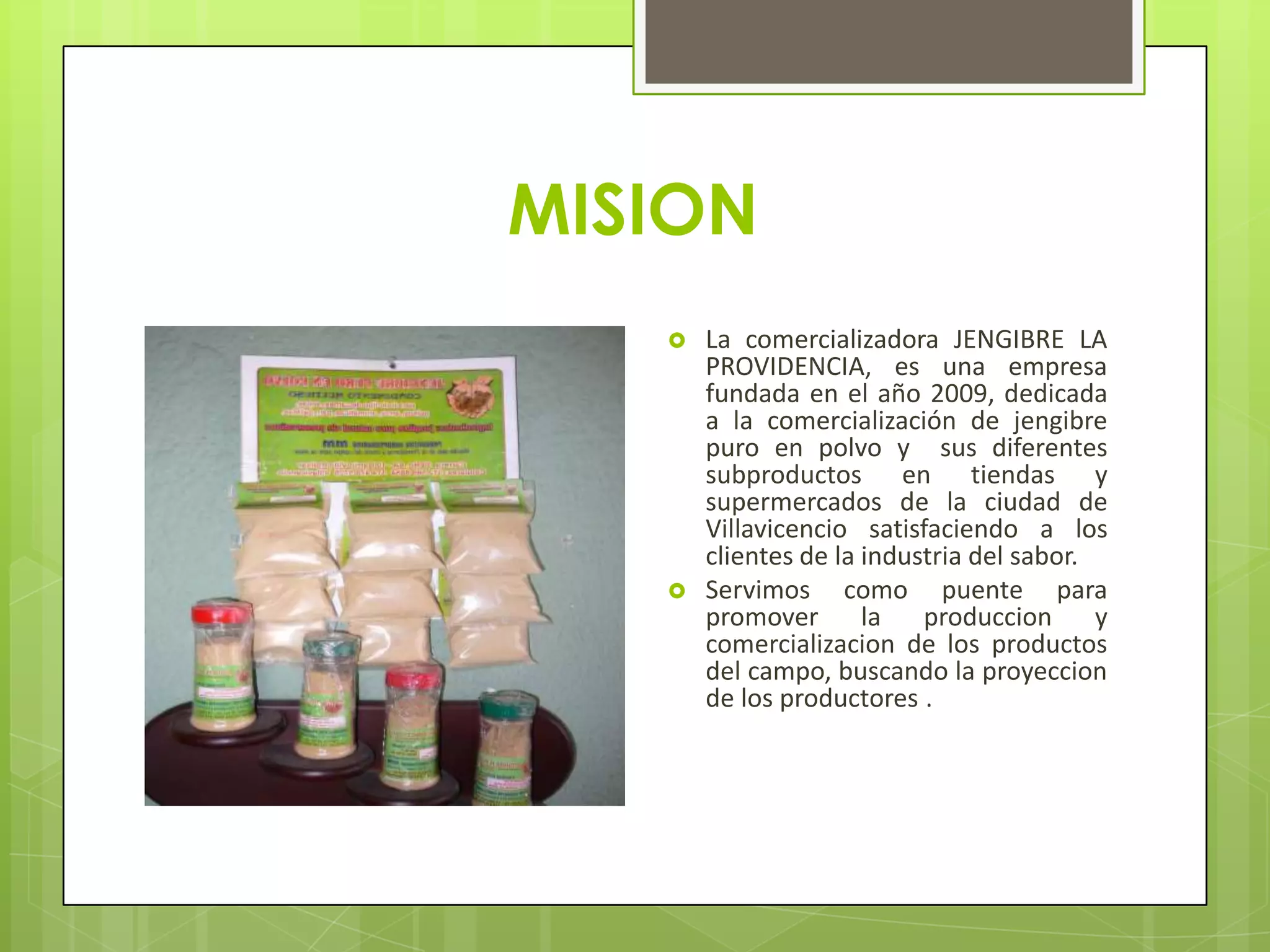 La comercializadora Jengibre La Providencia se fundó en 2009 y se dedica a la comercialización de jengibre puro en polvo y sus subproductos en tiendas y supermercados de Villavicencio. Su misión es servir como puente entre productores y consumidores para promover la producción y comercialización de productos del campo. Su visión es convertirse en líder en la comercialización de jengibre en Villavicencio para 2015 con un enfoque en la alimentación saludable. Su objetivo general es fortalecerse