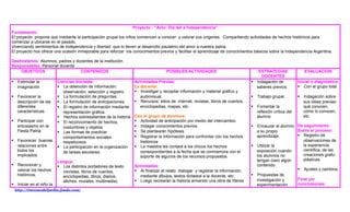Este documento describe un proyecto para conmemorar el Día de la Independencia Argentina con niños. El proyecto tiene como objetivos familiarizar a los niños con hechos históricos sobre la independencia, desarrollar el amor por su patria y favorecer buenas relaciones de grupo. Las actividades propuestas incluyen una obra de títeres sobre el viaje a Tucumán y expresiones artísticas para representar la época de la independencia. El proyecto concluirá con una presentación de la obra para padres y otros estudiantes en el D