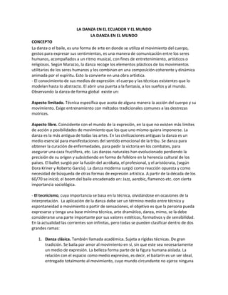 El documento describe la danza como una forma de arte que utiliza el movimiento del cuerpo y los gestos para expresar sentimientos de manera artística o religiosa. Explica que existen dos grandes ramas de danza: la danza clásica, que se sujeta a técnicas rígidas, y la danza moderna, que busca liberar el cuerpo. Además, resume brevemente la historia de la danza desde las pinturas rupestres hasta el desarrollo de estilos como el ballet, la danza moderna y danzas populares en