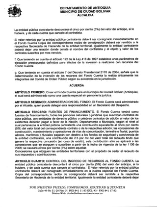 El documento propone la creación del Fondo de Seguridad con carácter de Fondo Cuenta para el municipio de Ciudad Bolívar, Antioquia. El Fondo se administrará como una cuenta especial sin personería jurídica y será administrado por el Alcalde. Los recursos del Fondo provendrán de contribuciones sobre contratos públicos y concesiones y serán invertidos en seguridad ciudadana según lo determine el Comité de Orden Público municipal.