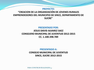Este proyecto propone la creación de una organización de jóvenes rurales emprendedores en el municipio de Sincé, departamento de Sucre. El objetivo es mejorar la participación de los jóvenes rurales a través de la formación de líderes comunitarios, la creación de redes de comunicación, y el desarrollo de proyectos productivos. Se realizaría un cronograma de actividades en 4 corregimientos con el fin de capacitar a 20 beneficiarios directos y beneficiar indirectamente a más miembros de la comunidad. El presup