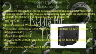 Este documento describe los componentes y equipamiento propuestos para un nuevo ciber café llamado "Legión", incluyendo 4 computadoras, impresora, escáner, cámara web, micrófono, audífonos, UPS, sillas ergonómicas, escritorios, teclado, mouse y más. También incluye instrucciones para instalar el equipo, medidas de seguridad e higiene y un manual de mantenimiento para el equipo.