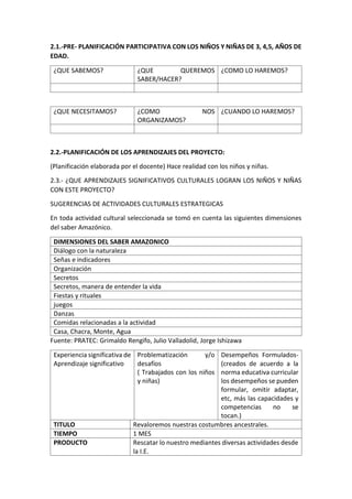 Este proyecto de aprendizaje tiene como objetivo promover la nutrición de los niños y niñas a través de alimentos a base de maní. Se llevará a cabo en la Institución Educativa Inicial N° 429 durante el periodo de 1 al 19 de julio. El proyecto busca que los niños interactúen con la naturaleza mediante la siembra y cuidado de un biohuerto de maní, desarrollando competencias en comunicación, lenguaje y matemáticas. Se espera que los niños exploren materiales artístic