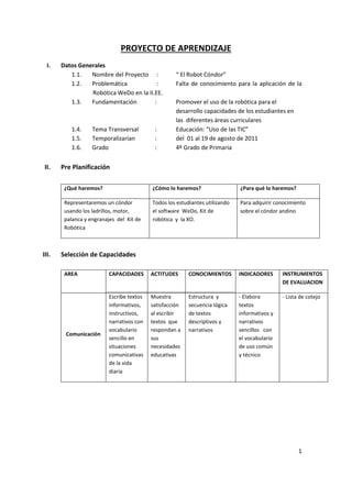 Este documento presenta un proyecto de aprendizaje sobre la construcción de un robot cóndor usando el kit de robótica WeDo. El proyecto se llevará a cabo con estudiantes de 4to grado de primaria y busca promover el uso de la robótica para desarrollar capacidades en diferentes áreas. El proyecto incluye la planificación, objetivos, capacidades a desarrollar, actividades y evaluación.