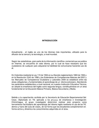 Este documento propone usar plataformas de aprendizaje de idiomas gratuitas en internet como Duolingo y Aba para reforzar el aprendizaje del inglés entre los estudiantes de noveno grado de una escuela. Actualmente los estudiantes no muestran mucho interés en el inglés y sólo lo estudian para pasar la asignatura. El objetivo es motivar a los estudiantes a aprender inglés de manera autodirigida usando los recursos tecnológicos disponibles para complementar las clases regulares.