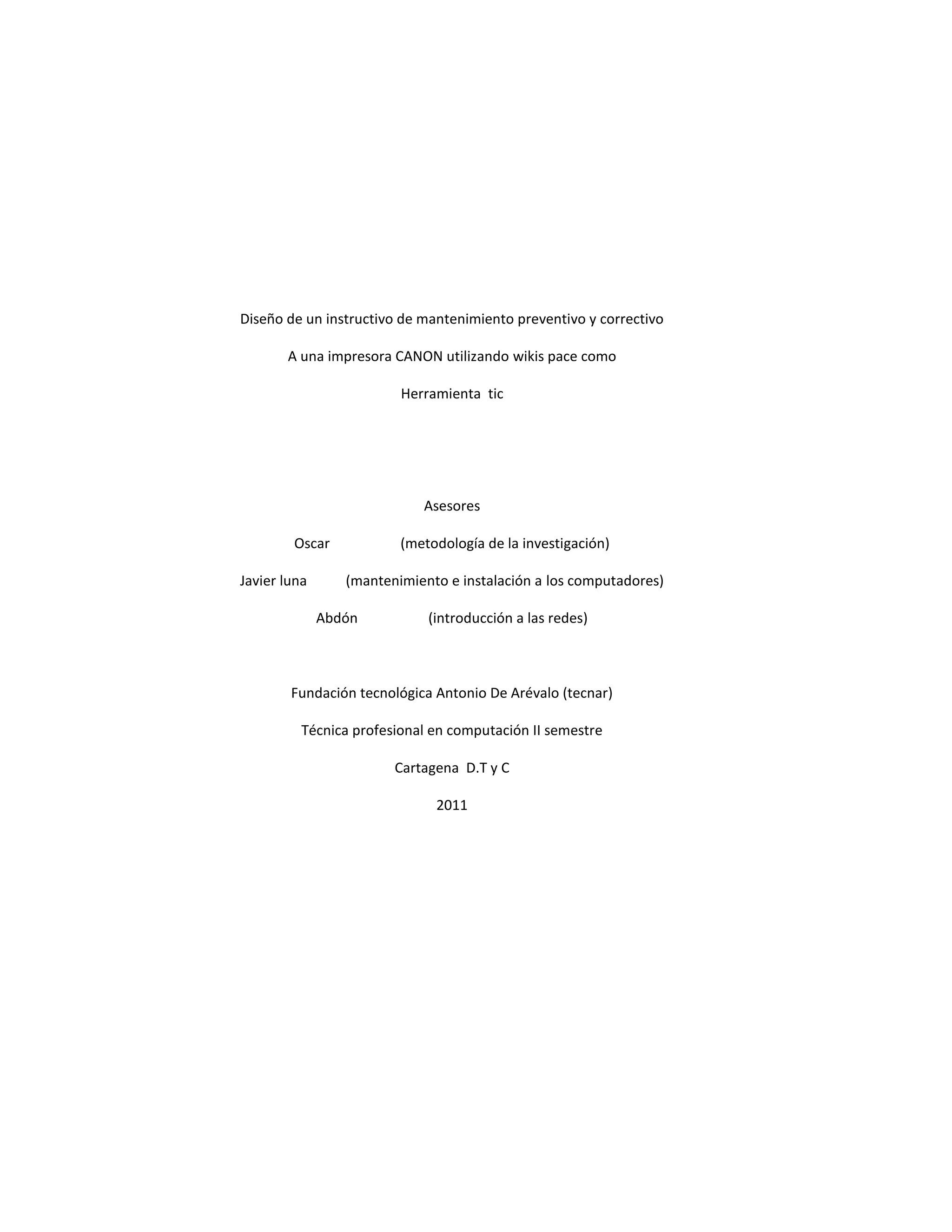 Este documento describe el desarrollo de un instructivo de mantenimiento preventivo y correctivo para una impresora Canon MP 250 utilizando la herramienta WikiS Pace. El instructivo tiene como objetivo principal proporcionar información fácil de entender para solucionar problemas comunes que puedan surgir en la impresora. Se realizará un estudio detallado de las características y funcionalidad de la impresora Canon MP 250 y se identificarán los pasos a seguir para resolver problemas.