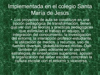 El documento describe un proyecto de aula implementado en una escuela primaria. Los proyectos de aula promueven el trabajo en equipo, la integración de conocimientos, la investigación del entorno y la interacción entre profesores y estudiantes. El proyecto de aula en la escuela involucra a todos los grados y áreas de conocimiento de una manera lúdica para que los estudiantes exploren y profundicen los temas correspondientes a su grado. Durante el año, los estudiantes participan en actividades como elaborar platos tí