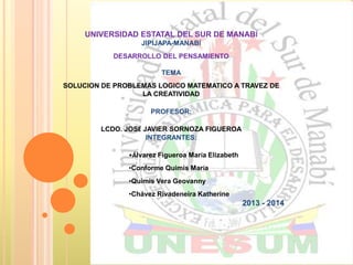 Este documento describe un proyecto realizado por estudiantes y profesores de la Universidad Estatal del Sur de Manabí en Ecuador. El objetivo del proyecto era fomentar la creatividad y el pensamiento creativo en los estudiantes a través de estrategias y técnicas para resolver problemas lógico-matemáticos de manera creativa. El documento explica varias técnicas para estimular la creatividad individual y en grupo como tormentas de ideas, mapas mentales y métodos analógicos.