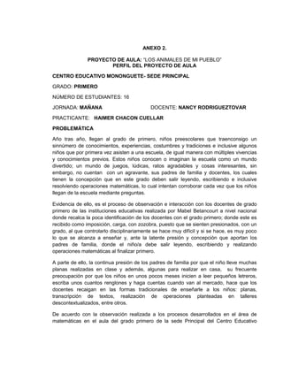 Este proyecto de aula busca potenciar el aprendizaje de la suma en niños de primer grado a través de actividades basadas en los animales de su pueblo, usando el juego de roles. Actualmente, la enseñanza de matemáticas es rígida y descontextualizada. El proyecto diagnosticará el estado actual y desarrollará 10 secuencias didácticas con juego de roles para enseñar suma hasta tres dígitos, promoviendo aprendizaje significativo. Evaluará el impacto de usar esta estrategia para mejorar la compet