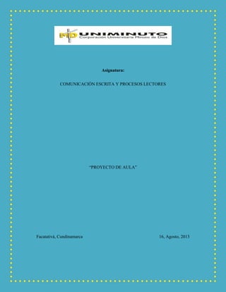 Este documento presenta un proyecto de aula sobre cuentos. El proyecto busca fortalecer los procesos de lectura y escritura en niños a través de actividades como la producción de cuentos, identificación de personajes y partes del cuento, descripción de escenarios, y fomento de valores. El proyecto se desarrollará a través de lecturas de cuentos, juegos con imágenes, escritura e invento de historias, elaboración de títeres y dramatizaciones.