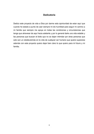 El documento presenta el proyecto de vida del estudiante Carlos Pluas. En él, Carlos dedica su proyecto a Dios y a su familia, y agradece el apoyo de su madre, tía, hermano y abuelos. Luego describe su autobiografía, rasgos de personalidad, análisis DAFO, y planes para los próximos 5-10 años que incluyen obtener un título de tercer nivel y maestría para conseguir un trabajo bien remunerado y apoyar a su familia.