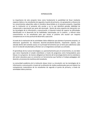 Este documento describe un proyecto que utiliza herramientas tecnológicas como una estrategia para mejorar el aprendizaje de operaciones con fracciones en estudiantes de primaria. El proyecto usa actividades lúdicas y didácticas en software como J-Clic para motivar a los estudiantes y ayudarlos a fortalecer sus habilidades con fracciones de una manera más entretenida. El documento también explica conceptos clave sobre fracciones y detalla el marco metodológico y cronograma del proyecto.