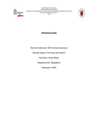 El documento presenta un proyecto pedagógico de la IED Técnica Guachaca que busca integrar las TIC en la educación de estudiantes de primaria en un contexto rural, enfatizando en el turismo y nuevas metodologías educativas. Se plantean objetivos específicos para promover el uso de tecnologías, mejorar la cobertura educativa, y fortalecer el currículo a través de la colaboración entre docentes y estudiantes. La metodología es cualitativa y la evaluación se centrará en la participación activa de la comunidad educativa para fomentar el aprendizaje a través de herramientas digitales.