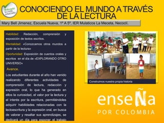Estos documentos resumen varios proyectos de aula que se están llevando a cabo en diferentes instituciones educativas. Los proyectos se enfocan en desarrollar habilidades como la lectura, la escritura, el inglés, las ciencias naturales, los valores y la creatividad a través de actividades como exposiciones, ferias, días temáticos y talleres. Los estudiantes están adquiriendo conocimientos y aprendiendo a expresarse mientras trabajan en estos proyectos durante el año escolar.
