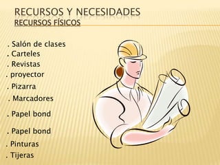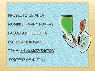 Este documento presenta un proyecto de aula sobre alimentación para estudiantes de tercero de básica. El proyecto utilizará recursos físicos como salones de clase, carteles y materiales de escritura, e involucrará recursos humanos como la organización de grupos de estudiantes. El proyecto busca reducir el riesgo de enfermedades a través de la buena alimentación y la higiene, y mejorar los estilos de vida alimenticios de los niños. Se llevará a cabo durante tres horas seman