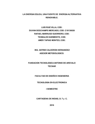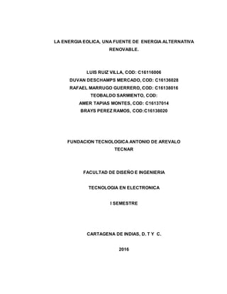 Este documento presenta un proyecto sobre el uso de la energía eólica como fuente de energía renovable en Cartagena, Colombia. El proyecto busca generar energía eléctrica a través de aerogeneradores para mejorar el alumbrado público en algunas vías y zonas de la ciudad que actualmente no cuentan con este servicio. El documento describe el problema de la escasez de energía en épocas de verano debido al fenómeno de El Niño y justifica la necesidad de encontrar fuentes de energía alternativas. Finalmente, presenta