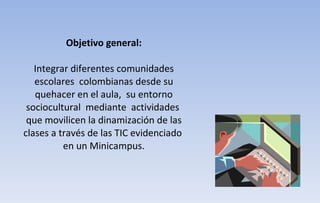 Este documento describe un proyecto para integrar comunidades escolares colombianas mediante el uso de las TIC y el trabajo colaborativo. El objetivo general es dinamizar las clases a través de actividades que compartan las experiencias de los profesores en el Campus Party 2011 y construyan conocimiento colectivo usando herramientas TIC. El proyecto se llevará a cabo en 4 fases que incluyen planificación, sensibilización, ejecución y evaluación para motivar a los estudiantes y obtener aprendizaje significativo.