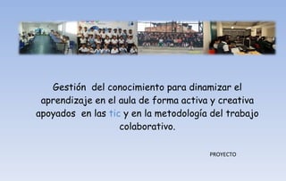 Este documento describe un proyecto para integrar comunidades escolares colombianas a través de actividades que utilizan las TIC para dinamizar el aprendizaje en el aula de forma colaborativa. El objetivo general es compartir experiencias del Campus Party 2011 y construir conocimientos colectivos usando herramientas TIC. El proyecto se implementará en 4 fases que incluyen planificación, sensibilización, ejecución y evaluación de actividades apoyadas en software libre y redes sociales como un blog y un Minicampus.