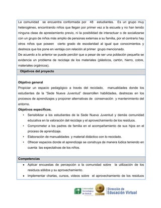 El proyecto pedagógico en la institución educativa Germán Vargas Cantillo busca sensibilizar a estudiantes y padres sobre la importancia del reciclaje y el cuidado del medio ambiente mediante actividades prácticas, talleres y el uso de TIC. Se enfoca en motivar la participación de la comunidad educativa en la recolección y reutilización de materiales reciclables, promoviendo habilidades manuales y la conciencia ecológica. La duración del proyecto es de 10 meses y se propone una metodología basada en la recolección de residuos y la elaboración de manualidades educativas.