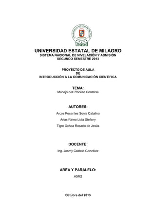 Este documento presenta un proyecto de aula sobre el manejo del proceso contable realizado por tres estudiantes y su docente para el área A5M2. El proyecto contiene el objetivo, introducción, desarrollo, conclusión y bibliografía sobre el tema. Explica que el proceso contable consiste en registrar las transacciones de una empresa para obtener estados financieros mediante pasos como el diario general, mayor general y balances. Concluye que este proceso permite elaborar los estados financieros que reflejan la situación económica