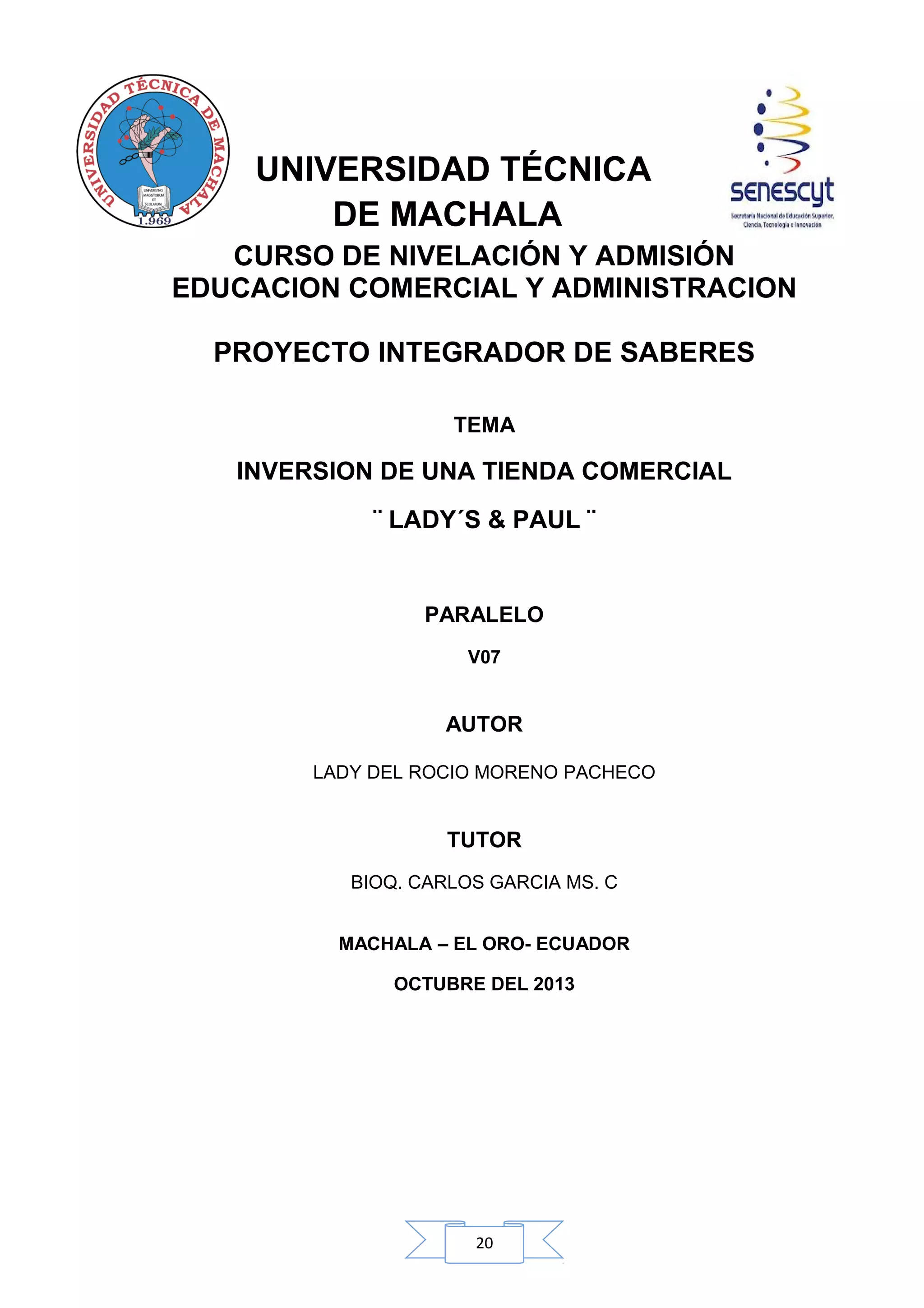 El documento presenta un proyecto de inversión para una tienda comercial llamada "Lady's & Paul" dedicada a la venta de ropa informal para personas entre 15 y 29 años en la ciudad de Machala, Ecuador. El objetivo general del proyecto es establecer una tienda de ropa que ofrezca calidad, diseños juveniles y precios económicos para satisfacer las necesidades de vestimenta de los clientes potenciales.