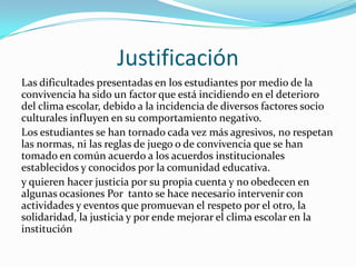 Este documento propone un proyecto para mejorar el clima escolar y promover valores como el respeto y la solidaridad en estudiantes de quinto grado a través de actividades que utilizan las TIC. El proyecto incluye presentar cuentos infantiles usando video, realizar talleres sobre valores y establecer mesas de diálogo para resolver conflictos aplicando los valores aprendidos. El objetivo es disminuir problemas de comportamiento e incrementar una sana convivencia en la escuela.
