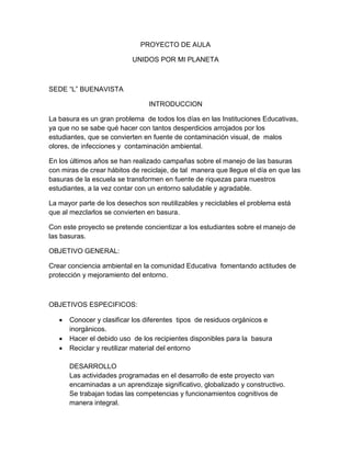 Este documento presenta un proyecto de aula llamado "Unidos por mi planeta" cuyo objetivo general es crear conciencia ambiental en la comunidad educativa fomentando la protección y mejoramiento del entorno. El proyecto busca concientizar a los estudiantes sobre el manejo adecuado de la basura a través de actividades como la clasificación de residuos, la creación de manualidades con material reciclable, y el diseño de avisos para promover el reciclaje. La evaluación del proyecto mostró que los estudiantes aprend