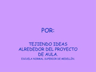 Este documento describe un proyecto de investigación de la Escuela Normal Superior de Medellín llamado "Tejiendo ideas alrededor del proyecto de aula". El objetivo del proyecto es determinar cómo el trabajo por proyectos en el aula puede desarrollar los intereses y la autonomía de los estudiantes y reparar a los estudiantes y su entorno. El proyecto se centra en poblaciones diversas y vulnerables de Medellín.