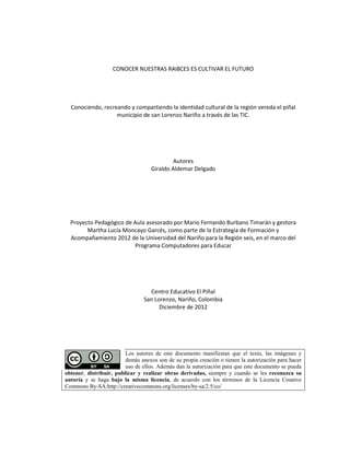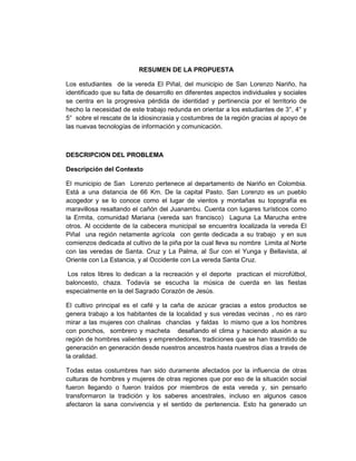 Este documento describe un proyecto para preservar la identidad cultural de la vereda El Piñal en San Lorenzo, Nariño, Colombia a través del uso de las TIC. Los estudiantes han identificado una pérdida progresiva de su cultura debido a influencias externas. El proyecto busca rescatar las tradiciones locales mediante la recopilación de información sobre la historia y costumbres de la región y compartiéndola a través de materiales didácticos digitales.